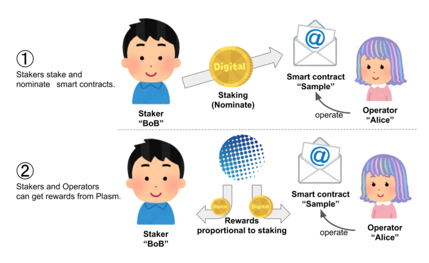 dApps Staking is a reward mechanism for developers of smart contracts. 50% of Plasm Network’s staking reward goes to application developers who have enhanced the value of the Plasm Network. Plasm allows the assignment of a smart contract administrator, called an “operator.” “Operators” can be “Nominated” by other dApps “Nominators.” As shown below, the operator of the smart contract receiving many nominations can obtain newly minted PLM tokens from the chain.